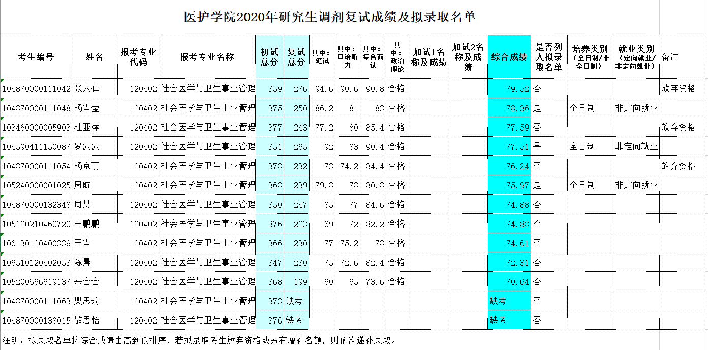 医护公司2020年研究生调剂复试成绩及拟录取名单
