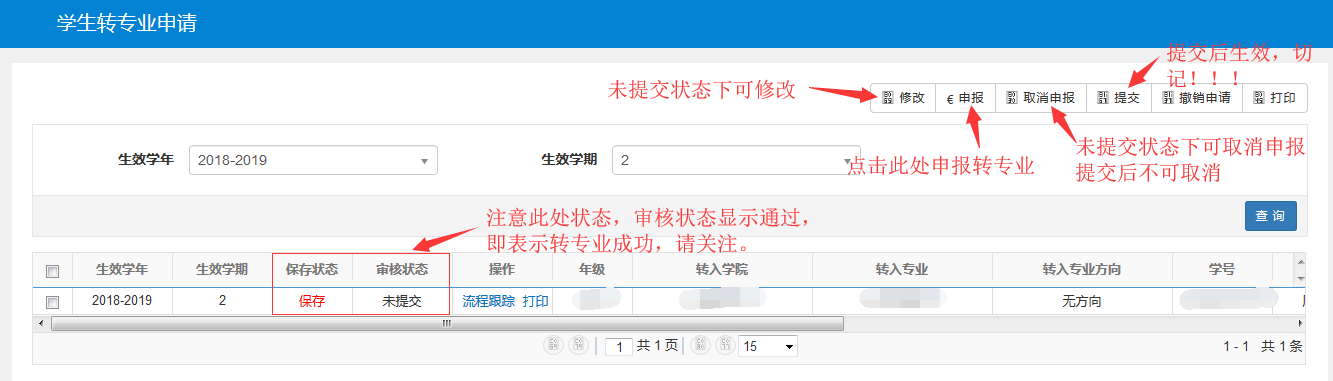 确认后提交转专业申请: