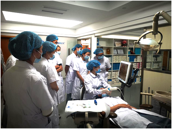 随后,参观指导员带领大家参观了特色儿童科室——三叶儿童口腔,及其牙椅诊室和口扫诊室,医院人情化的氛围和暖心的设计得到同学们的点赞。
