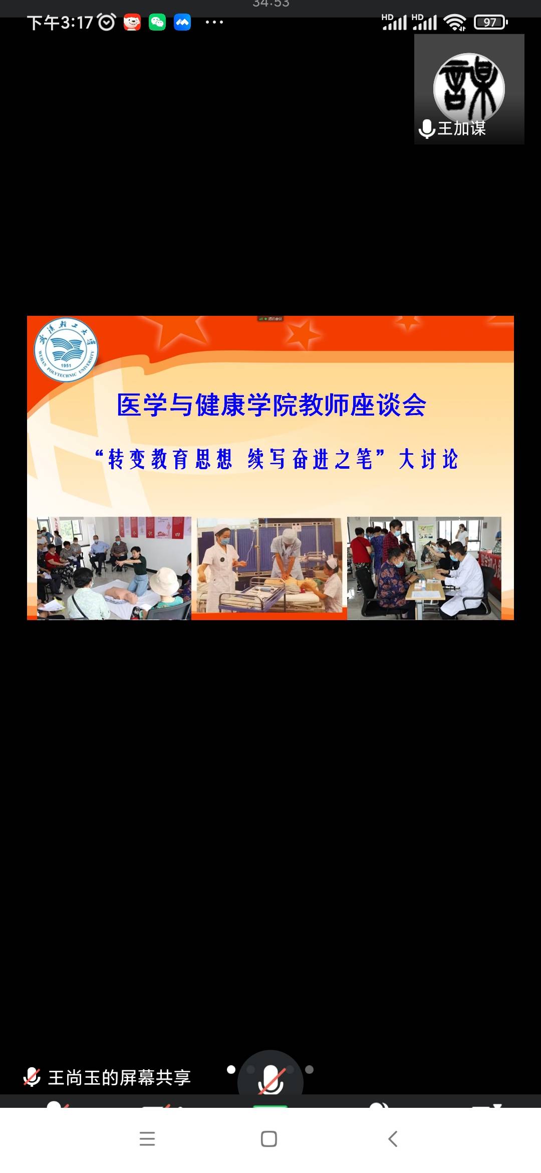 座谈会上,刘亚军、陈靖、王加谋、陈劲、彭超华等老师围绕会议主题,从聚焦新医科建设,我们的教育思想和观念的转变;我们要培养怎样的医学人才;怎样培养和为谁培养;在人才培养目标定位、人才培养模式、公司产品过程等方面如何适应新医科的要求等方面结合自身的教学工作实际纷纷谈了自己的想法和体会。