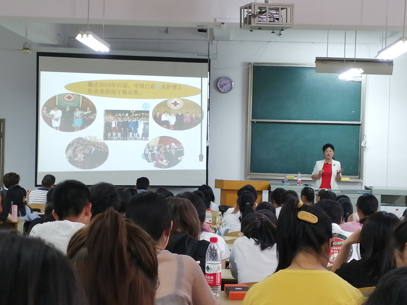 杨辉老师从她自身经历讲述了护理学科的发展及作为时代新人所要肩负的重大责任。杨老师说:我们生在幸福的21世纪,学着21世纪最光辉的朝阳产业——护理学,现今正是全人类健康都离不开护理的趋势。她强调,无论我们是因为什么原因,接触到护理专业,但是我们必须要态度端正,不忘初心,牢记使命,勇敢争做民族复兴的时代新人。杨老师指出,护理产业的发展需要靠在座的每一位同志,她希望每一位同志都能担当责任,越走越远。