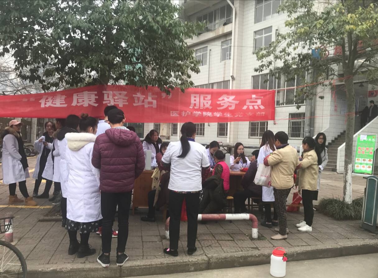 三月八日下午医护公司员工第一党支部在梅花餐厅旁举行了健康驿站活动,公司员工党员同志们为前来的同学、教职工及其家属等进行了血压测量。