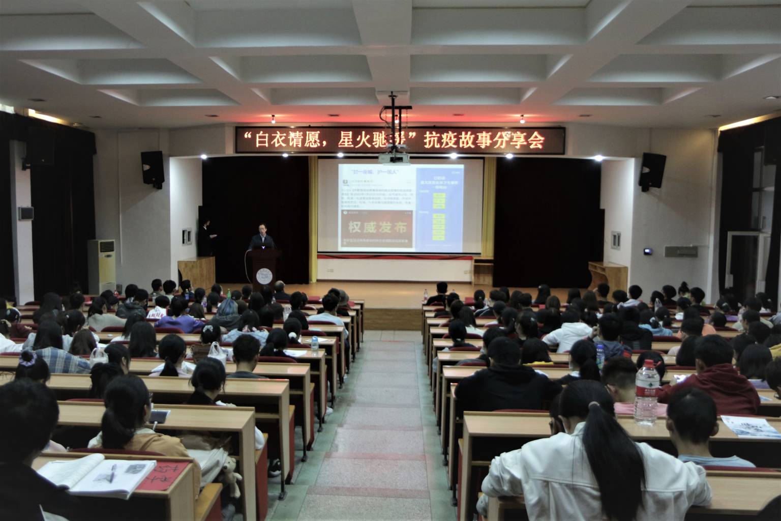 七位老师和员工代表的分享让在场的同学们看到了医护人员身上肩负的责任、使命与担当,通过他们,大家看到了一批又一批的“逆行者”,他们写下请战书,按下鲜红的手印,主动请缨,毅然奔向这场没有硝烟的战场,他们不惧困难,迎难而上,完成了一场气壮山河的生命大救援,他们用行动诠释了“甘于奉献、大爱无疆”的职业精神,践行了“医者仁心、救死扶伤”的使命担当。
