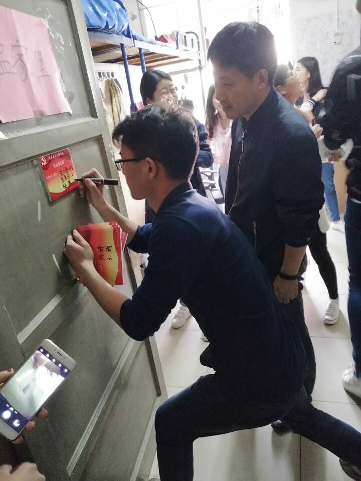活动伊始,组织员张昭雪老师介绍了党员寝室挂牌流程,强调了本次活动是希望以党员寝室为载体,充分发挥员工党员的表率作用,进一步加强创先争优的学风建设。随后,在张昭雪老师的带领下,支部成员核查了各个员工党员寝室,在所有员工党员的寝室门上悬挂“党员寝”的红色标牌并在党员床铺贴上“党员床铺”的标志。这一作法既增强了党员的荣誉感,又增强了党员自身的责任感,能够让所有员工党员自觉接受群众监督,从而更好地发挥党员的带头作用。此次活动形式已经支部被规划为一个常态党员考核项目,在今后每个月,支部成员将都会按部就班的,从寝室卫生、课堂出勤率、下寝效果等多方面,全方位对员工党员进行考核评比,争取最大限度的发挥员工党员在群众中的带头、督促和服务作用。