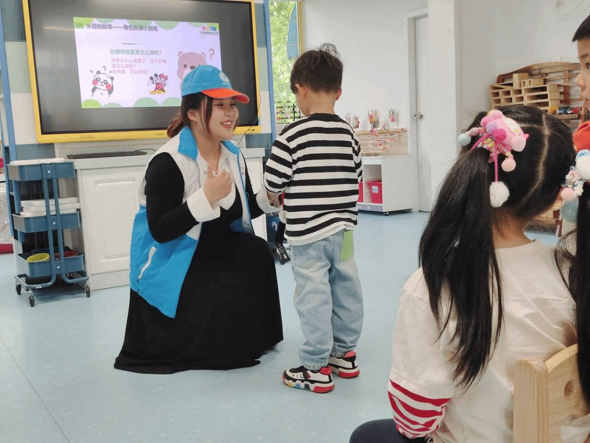 “如果和老师、小伙伴走散了,该怎么办呢?”随着PPT中米奇抛出问题,孩子们纷纷举起小手抢答:“不能乱跑!”“要找穿制服的工作人员!”志愿者余晓静通过互动问答和角色扮演,引导幼儿结合动画内容思考解决方案,并现场演示如何正确寻求帮助,让孩子们在趣味中学习自我保护技能。