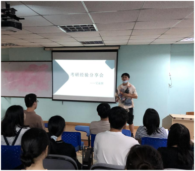 交流会中,付焕旭、吴凌智、胡安琪、林朝阳、袁绎凡、隆丽芳、王嘉森等7名考研成功的同学为正在备考的同学们传授了自己备战考研的经验。7位员工分别从各自的角度分享一路备考的心路历程,为2018级同学提出合理的建议。