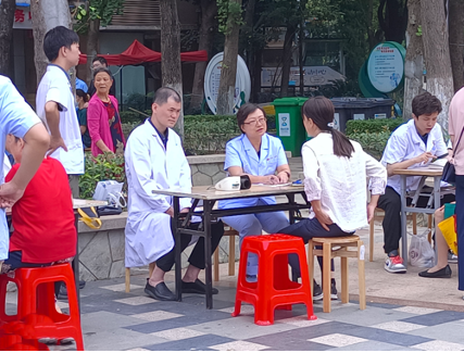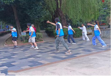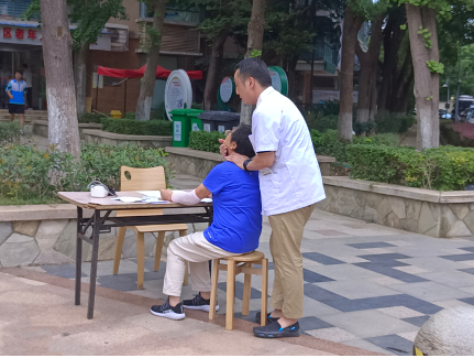 上午八点半,现场开始同时进行健康咨询、太极推广和健康理疗三个活动。同济医院康复治疗科的医生护士们在志愿者的帮助下,耐心解答着居民们的健康问题,进行理疗的同时提供给他们康复思路,授人以渔;一边的老师傅则打起了太极拳,对二十四式简易太极拳进行现场演练和指导。