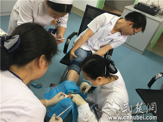 2016年7月6日武汉因连续多日强降雨,多处道路积水严重,交通严重受阻,公交、地铁多个路段停运,早上上班只能趟水艰难前行;公司康复科二病区地处工业二路31街,此处地势较低,病区围墙外水位高至膝关节以上,由于水位差,水不停向病区内灌注,造成病区2000余平米积水严重。病区全体工作人员启动紧急预案投入抢险工作。在此次行动中张莹带领其它实习生用棉被堵住电梯口,避免电梯受灾停运;并将病房积水反复用桶接力向外转运;及时将病人及财产转移至安全地带。陈锷,陈勇及其它工作人员一起涉水用沙包堵住院门及多处灌水处。在抢险过程中陈勇同学不幸踝背侧被候诊椅划伤,鲜血直滴仍坚持冒着大雨将手中沙包扛至灌水处,至始至终都未叫一声苦和累。他们不辞辛劳,奋力抢险协助工作人员确保了病区患者及设备的安全。