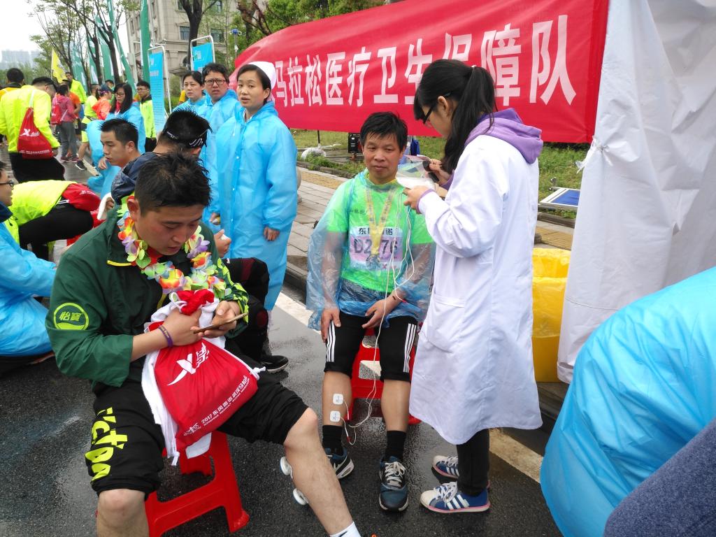 凌晨5时30分,轻工大师生便一同前往半程终点,提前备好处理赛后运动损伤的医疗物品。9时30分许,参与半程比赛的选手陆续来到终点医疗卫生服务点,医务人员纷纷热情接待伤员,并进行专业处理。由于雨中气温较低,加之运动员冲刺等多因素影响,发生肌肉痉挛的伤员占多数,对此使用了深层肌肉刺激仪(DMS)辅以肌肉牵伸进行放松;对于持续痉挛,在牵伸的基础上,使用低频电TENS进行持续放松,并借助肌内效贴维持效果。此外,多数比赛选手出现膝、踝的疼痛和擦伤等情况,均及时消毒并给予适当处理。临近12时,紧张而又忙碌的医疗救助服务伴随着受伤选手的声声感激而接近尾声。