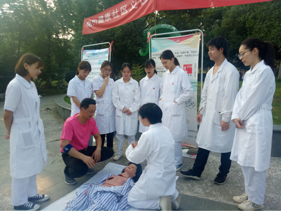 早上6:30按照义诊内容,活动分四部分进行:康复治疗、量血压、健康宣教以及CPR教学模拟。健康宣教组负责给社区居民讲解高血压等疾病的主要症状和预防措施以及中暑的症状和正确的洗手方法,即“六步洗手法”。CPR教学模拟组借助模型,现场试教,给居民展示如何进行急救、正确的急救方法以及注意事项,并让居民尝试,亲身体验。