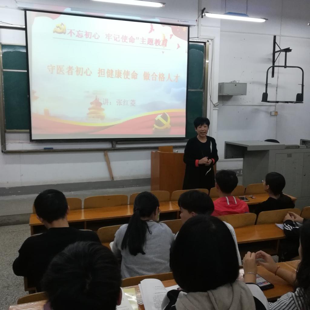 张书记首先提出“一个员工党员如何体现先锋模范带头作用”这个问题,从同学们所学的专业谈起,指出了员工党员应该如何将“不忘初心,牢记使命”主题教育与医务人员的初心和使命结合,在“健康中国2030”中肩负起自己的责任。