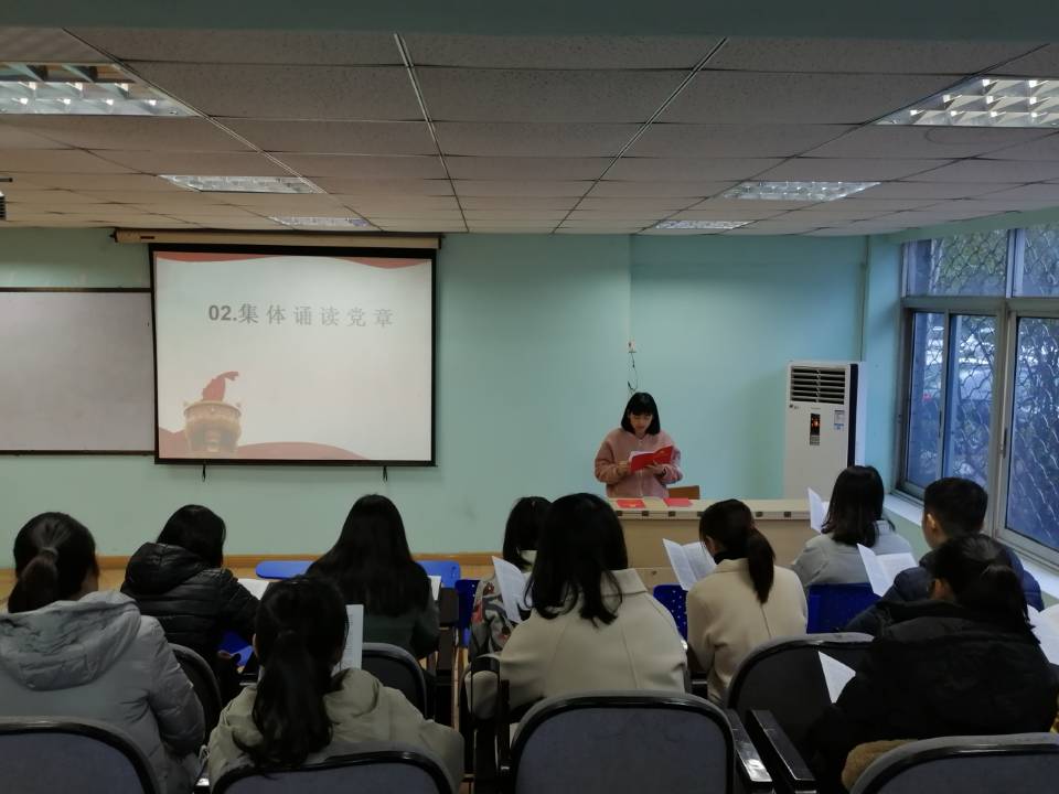 此次活动由医护公司研究生党支部副书记杨艳主持,18级党员及入党积极份子全体同志参加了本次活动。党支部书记胡海同志带领全体同志共同学习了此次重要内容。活动分为理论学习、缴纳党费、重温入党誓词、集体诵读党章、讨论交流五个部分组成。