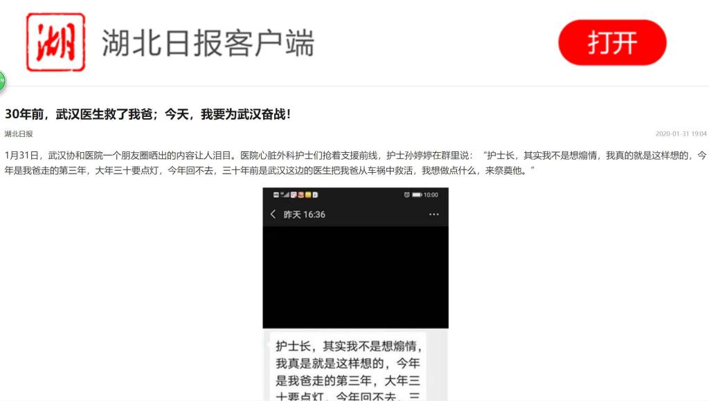 1月31日,武汉协和医院一个朋友圈晒出的内容让人泪目。医院心脏外科护士们抢着支援前线,护士孙婷婷在群里说:“护士长,其实我不是想煽情,我真的就是这样想的,今年是我爸走的第三年,大年三十要点灯,今年回不去,三十年前是武汉这边的医生把我爸从车祸中救活,我想做点什么,来祭奠他。”