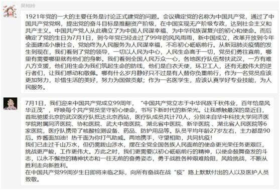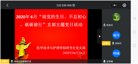 6月24日上午10点,医护公司研究生党支部全体同志依托腾讯会议开展了6月“迎党的生日、不忘初心、砥砺前行”线上主题党日活动,迎接中国共产党成立99周年。活动由支部组织委员吴裕玲同志主持。